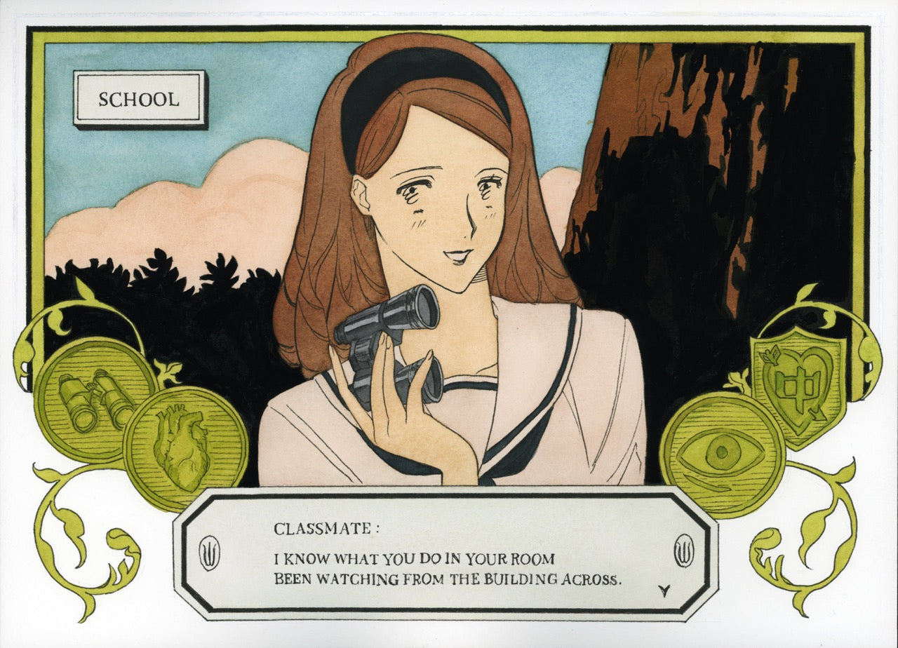 Work title: I'm watching you. Media: drawing paper, stylus pen, transparent watercolor. Size: 24.4×33.3 cm