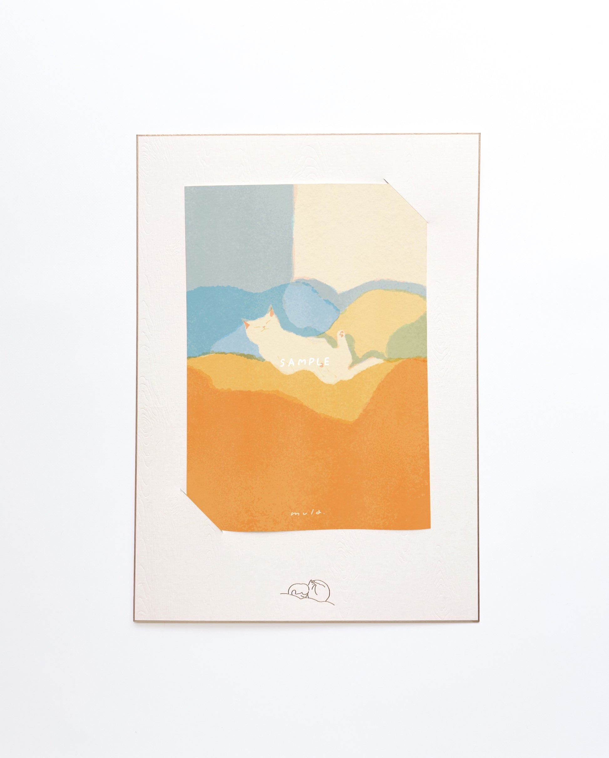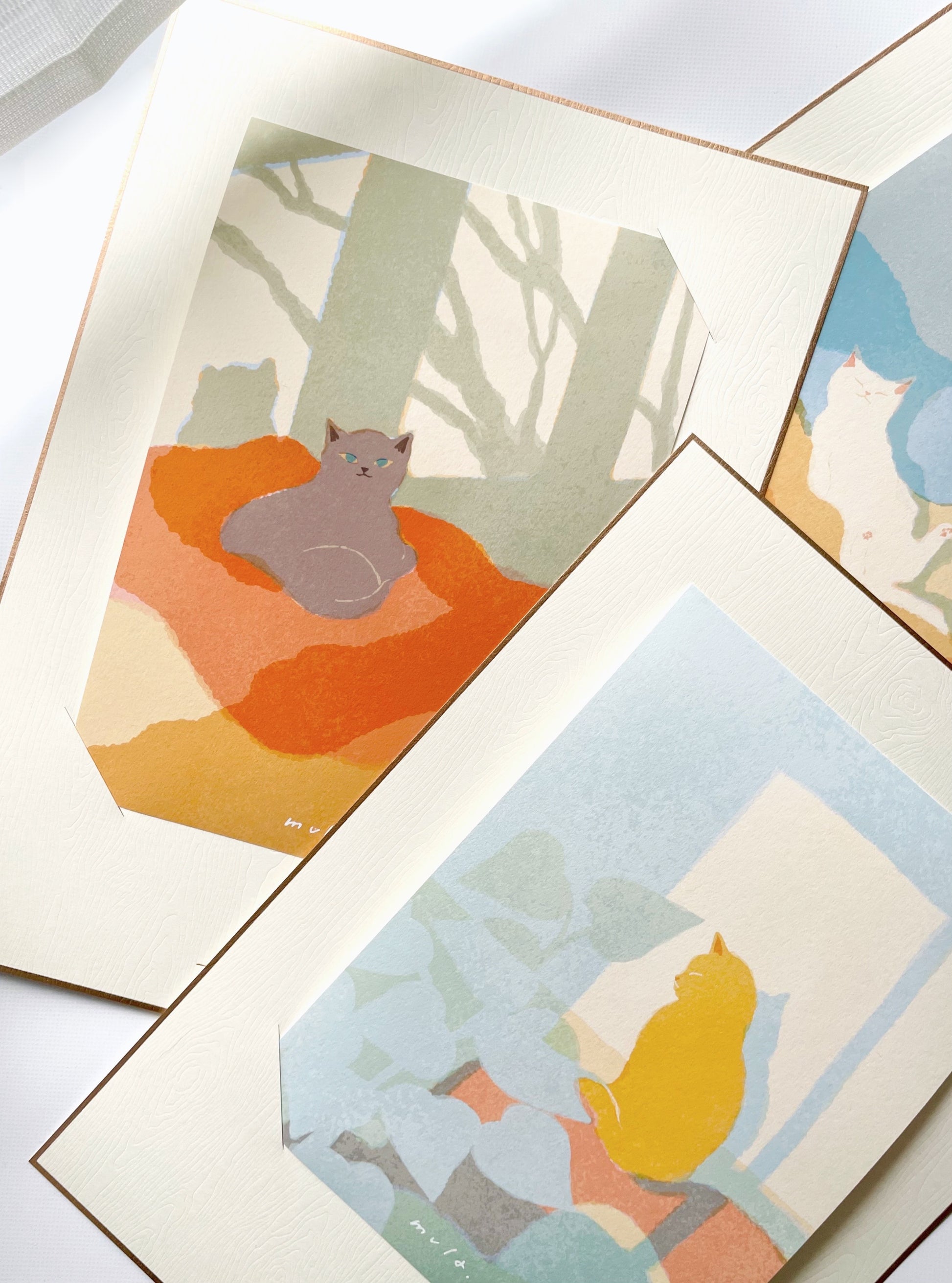 這次是我第一次參加日本以外的 POP-UP 活動。為了這次特別的機會,我創作了三幅以「ぽかぽか(暖暖陽光)」為主題、描繪貓咪享受日光浴的全新插畫。