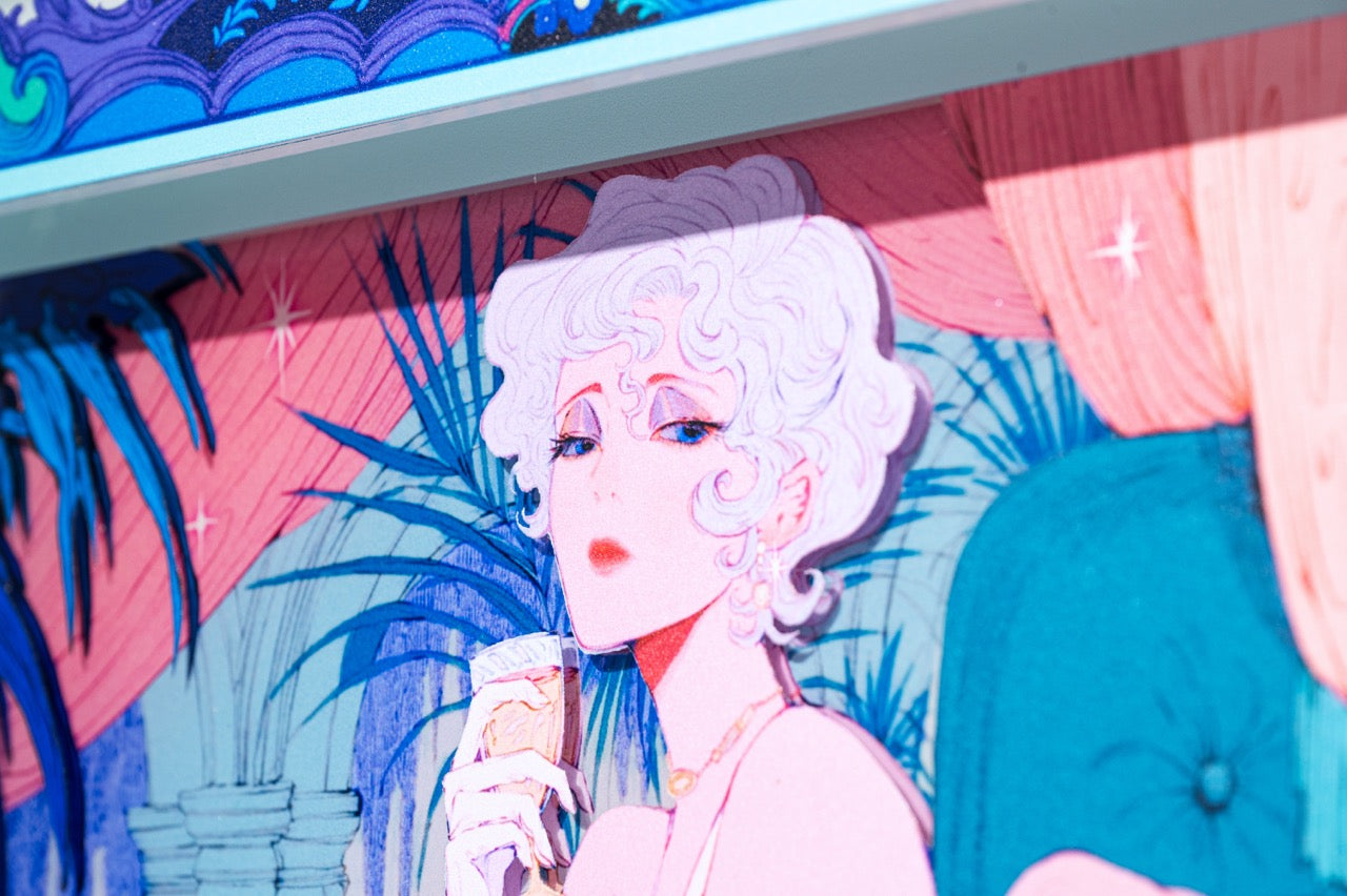 《Flower Temperature》靈感源自藝術家八館ななこ在台南的短暫生活,透過細膩的筆觸捕捉這座城市獨特的氣候與風情。台南的花籬、瓷磚與裝飾,以及南國微風帶來的清新與溫暖,共同交織出詩意盎然的視覺語言。