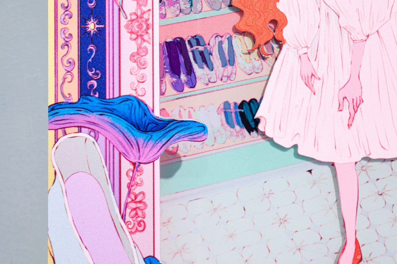 《Flower Temperature》靈感源自藝術家八館ななこ在台南的短暫生活,透過細膩的筆觸捕捉這座城市獨特的氣候與風情。台南的花籬、瓷磚與裝飾,以及南國微風帶來的清新與溫暖,共同交織出詩意盎然的視覺語言。